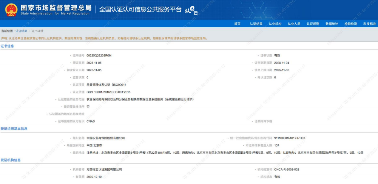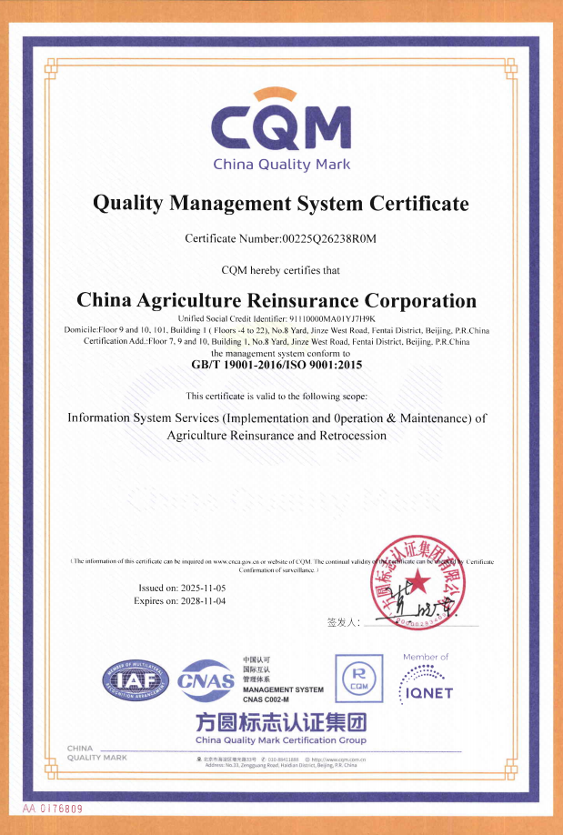 中国农再自成立以来,持续提升信息化建设管理水平。今年,公司组织开展质量管理体系认证工作并通过外部专业认证机构审核,获得了GB/T 19001-2016/ISO 9001:2015质量管理体系认证证书。证书证明公司数据信息系统服务达到了国标和ISO标准,有能力稳定地提供满足用户需求和法律法规要求的信息技术服务。今后,中国农再将继续提升信息化建设质量,持续提升用户满意度,推动公司主责主业高质量发展。